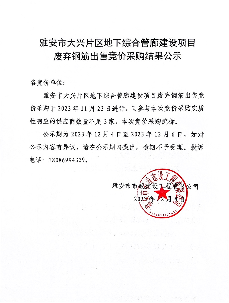 雅安市大興片區(qū)地下綜合管廊建設(shè)項(xiàng)目廢棄鋼筋出售競(jìng)價(jià)采購結(jié)果公示