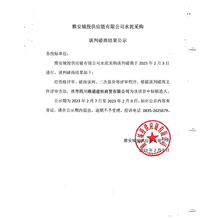 雅安城投供應(yīng)鏈有限公司水泥采購(gòu)談判磋商結(jié)果公示