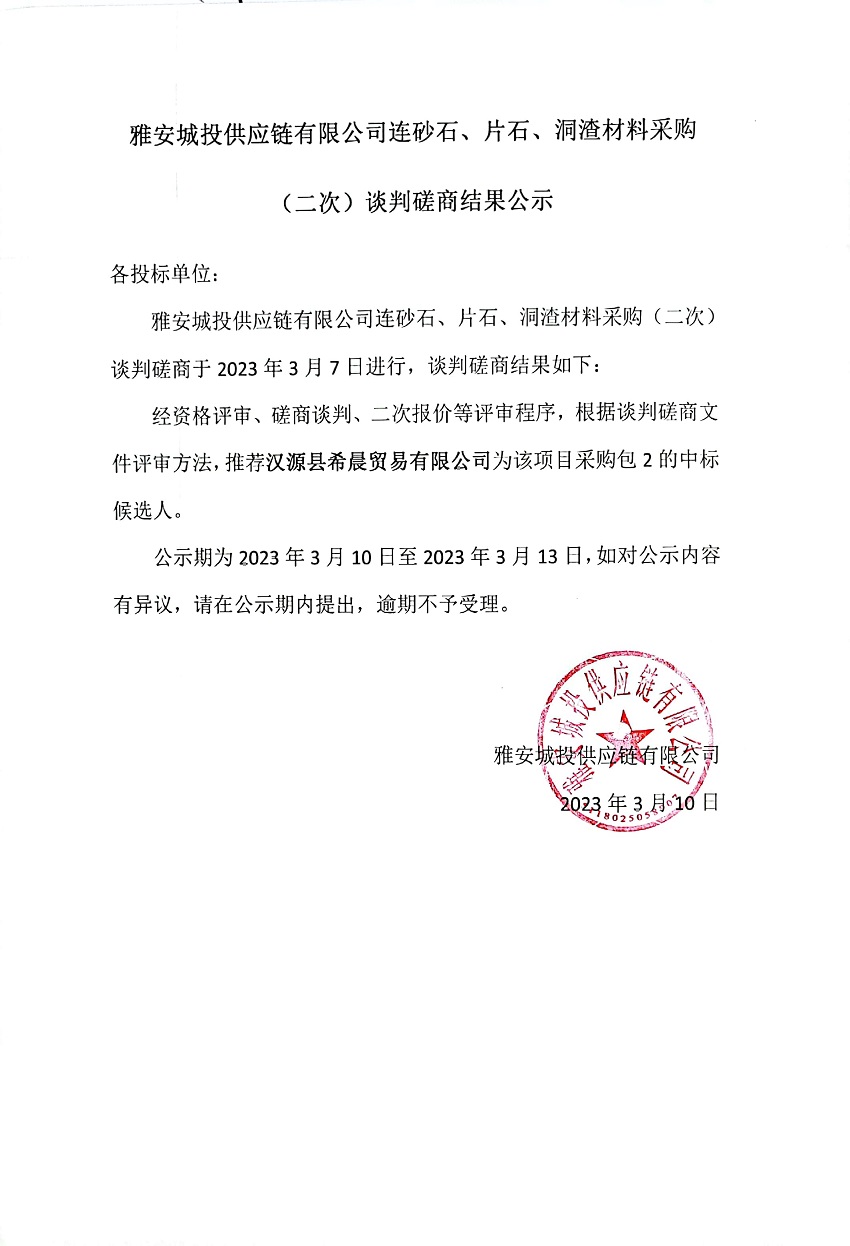 雅安城投供應(yīng)鏈有限公司連砂石、片石、洞渣材料采購(二次)談判磋商結(jié)果公示