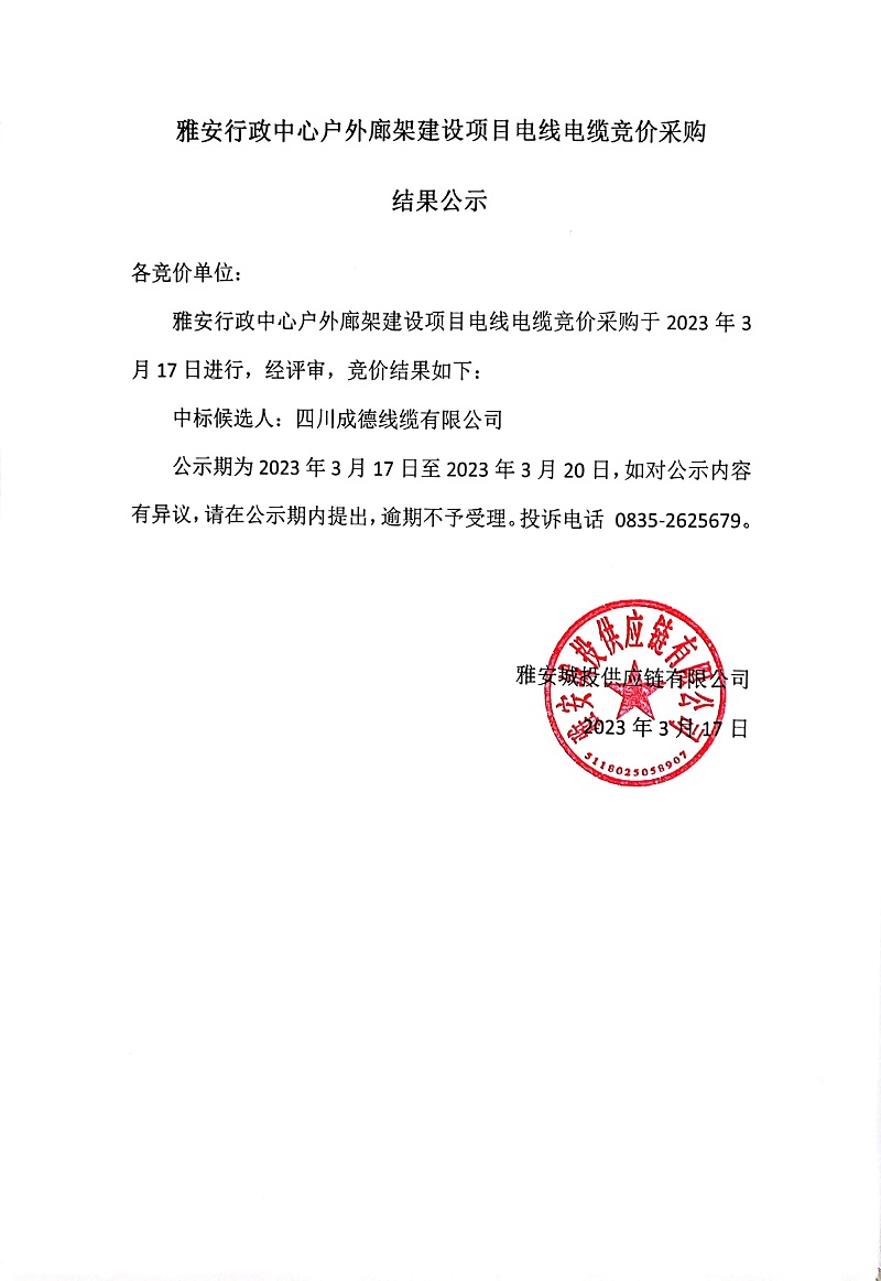 雅安行政中心戶外廊架建設(shè)項(xiàng)目電線電纜競價(jià)采購結(jié)果公示