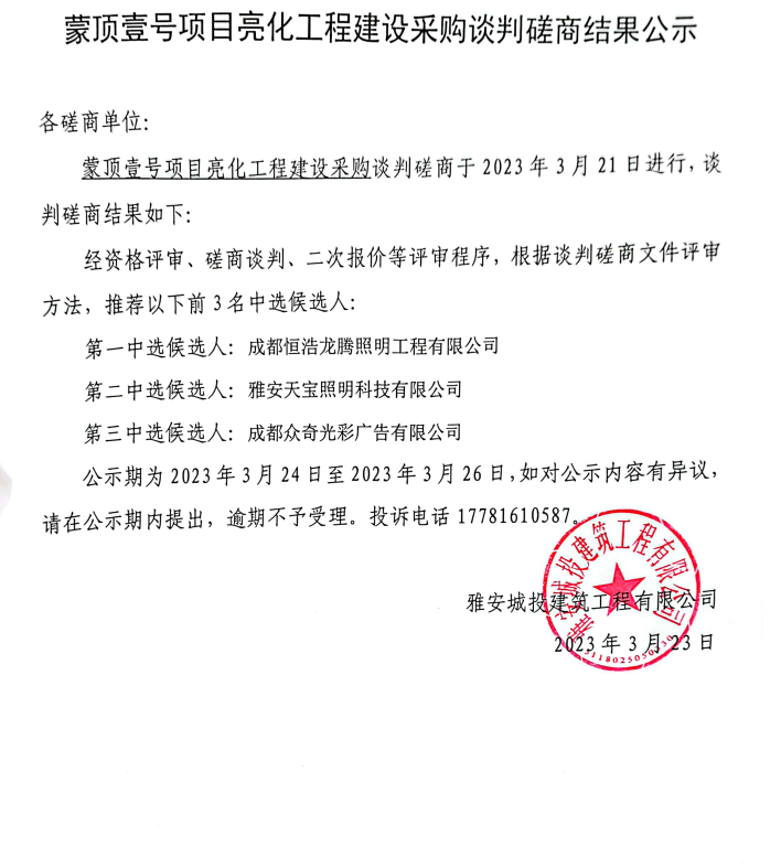 蒙頂壹號(hào)項(xiàng)目亮化工程建設(shè)采購談判磋商結(jié)果公示