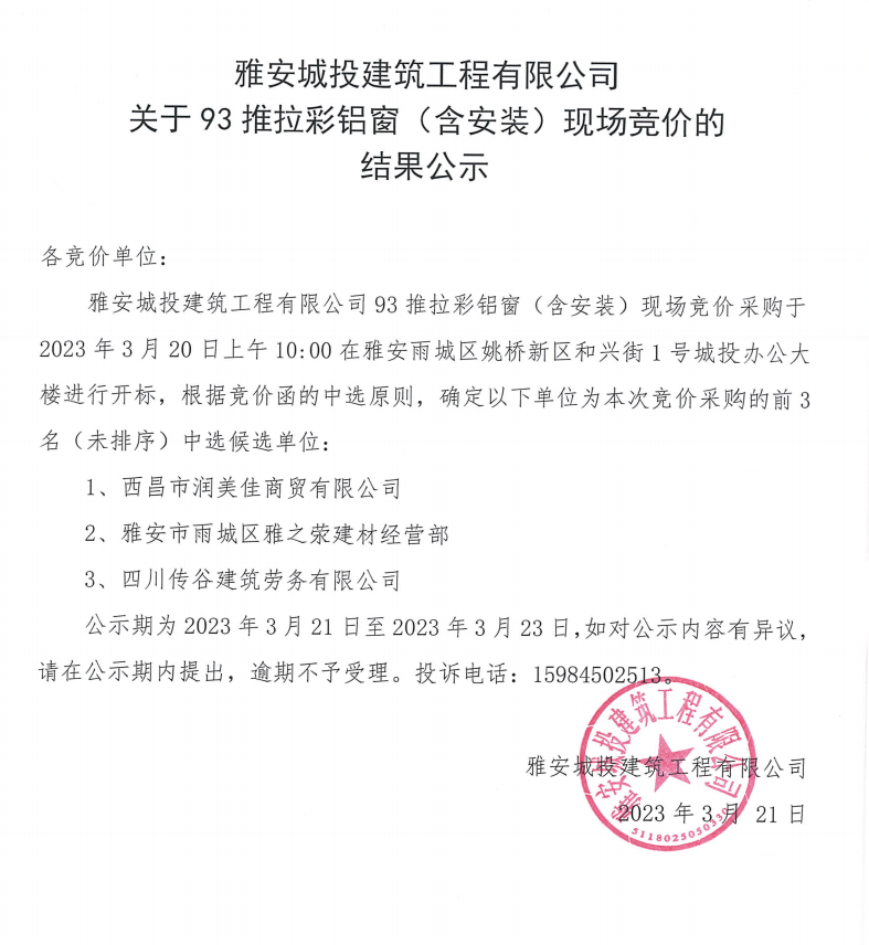 雅安城投建筑工程有限公司關于93推拉彩鋁窗(含安裝)現場競價的結果公示
