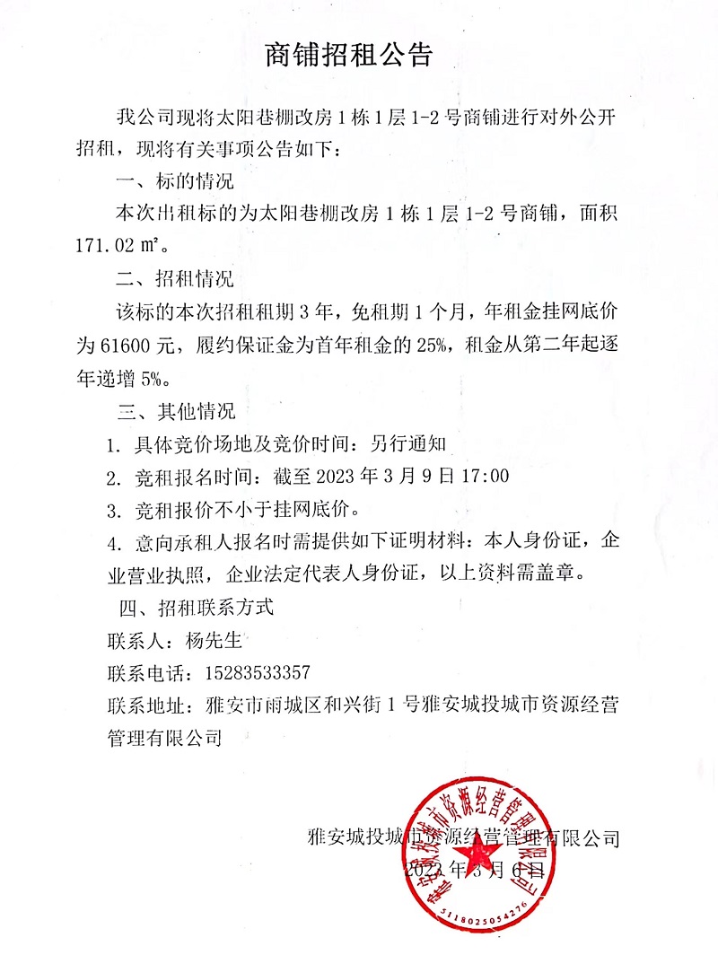 太陽(yáng)巷棚改房1棟1層1-2號(hào)商鋪招租公告
