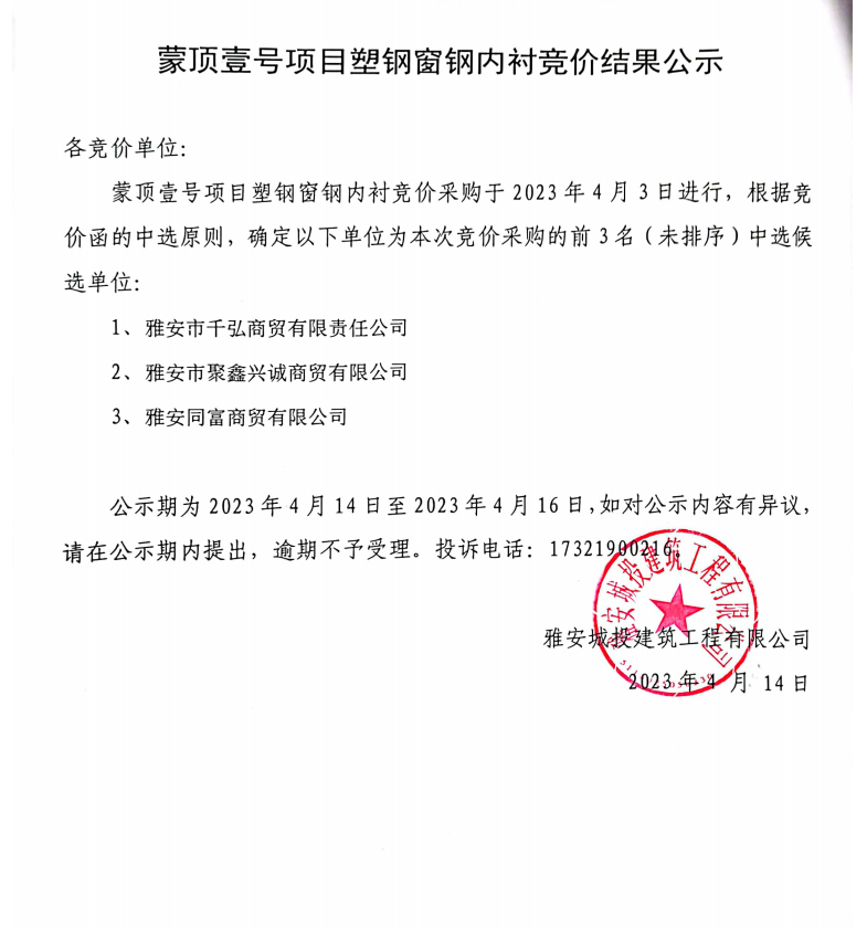 蒙頂壹號(hào)項(xiàng)目塑鋼窗內(nèi)襯競(jìng)價(jià)結(jié)果公示