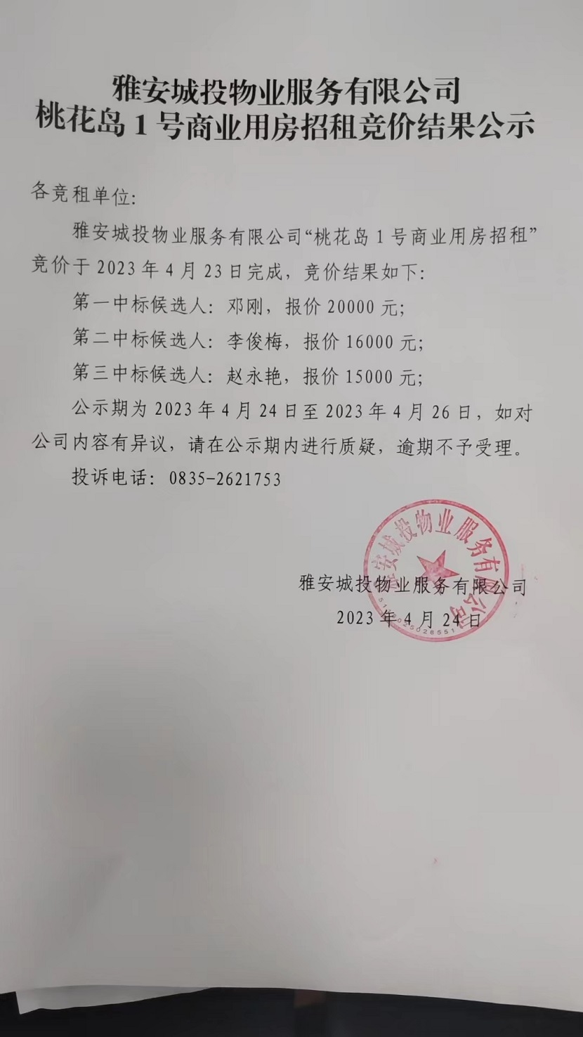 雅安城投物業(yè)服務(wù)有限公司桃花島1號商業(yè)用房招租競價(jià)結(jié)果公示