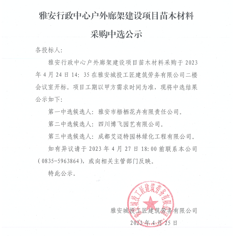 雅安行政中心戶外廊架建設(shè)項(xiàng)目苗木材料采購(gòu)中選公示