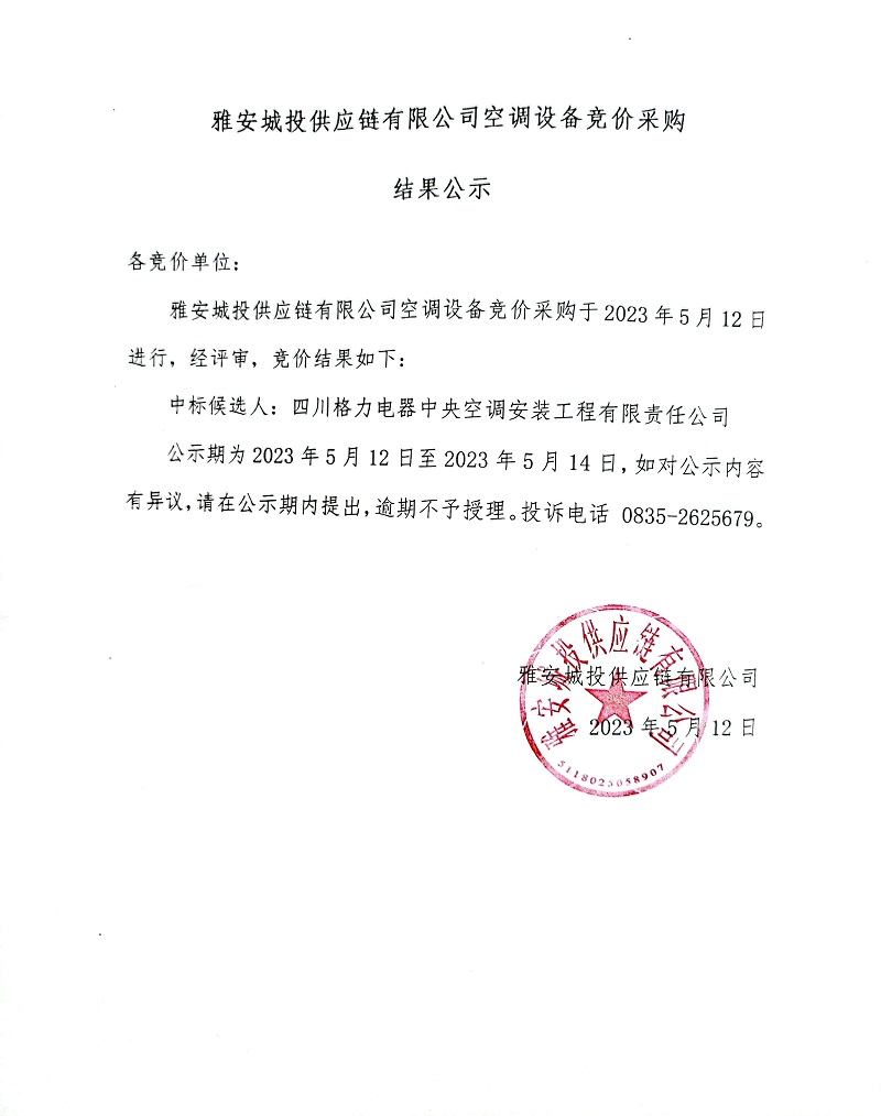 雅安城投供應鏈有限公司空調(diào)設備競價采購結(jié)果公示
