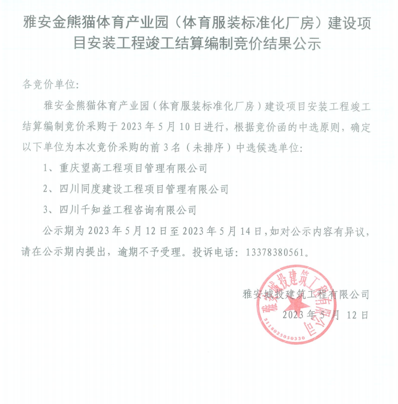 雅安金熊貓?bào)w育產(chǎn)業(yè)園(體育服裝標(biāo)準(zhǔn)化廠房)建設(shè)項(xiàng)目安裝工程結(jié)算編制競(jìng)價(jià)結(jié)果公示