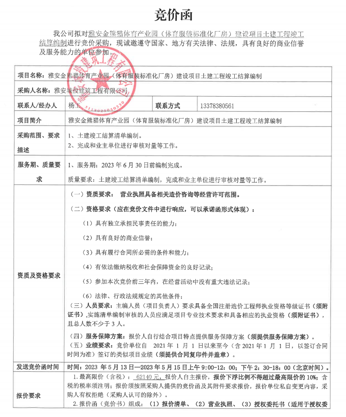 雅安金熊貓體育產(chǎn)業(yè)園(體育服裝標準化廠房)建設(shè)項目土建工程竣工結(jié)算編制競價公告
