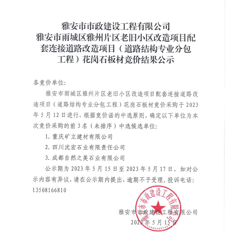 雅安市市政建設(shè)工程有限公司雅安市雨城區(qū)雅州片區(qū)老舊小區(qū)改造項(xiàng)目配套連接道路改造項(xiàng)目(道路結(jié)構(gòu)專業(yè)分包工程)花崗石板材競價(jià)結(jié)果公示