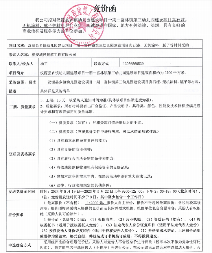 漢源縣鄉(xiāng)鎮(zhèn)幼兒園建設(shè)項(xiàng)目一期一富林鎮(zhèn)第三幼兒園建設(shè)項(xiàng)目真石漆、無機(jī)涂料、膩?zhàn)拥炔牧喜少徃?jìng)價(jià)公告