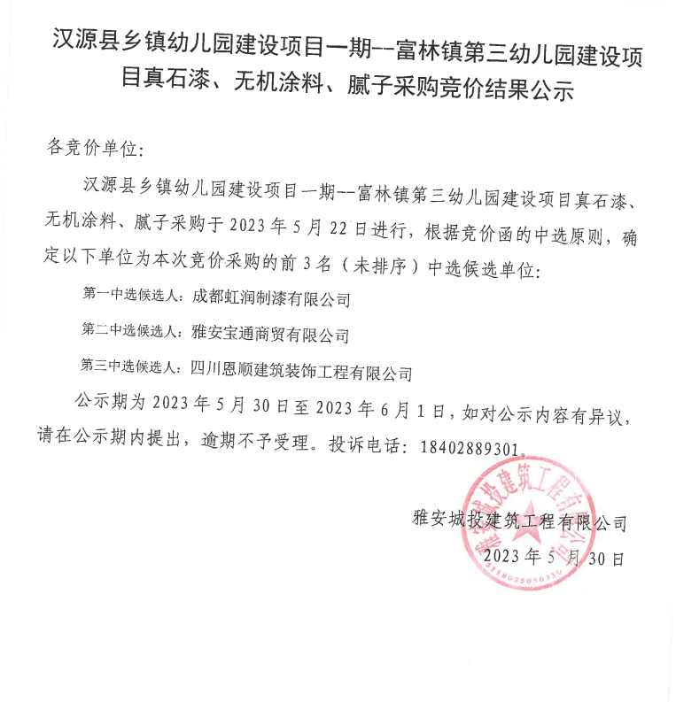 漢源縣鄉(xiāng)鎮(zhèn)幼兒園建設(shè)項目一期--富林鎮(zhèn)第三幼兒園建設(shè)項目真石漆、無機涂料、膩子采購競價結(jié)果公示