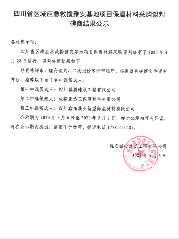 四川省區(qū)域應急救援雅安基地項目保溫材料采購談判磋商結(jié)果公示