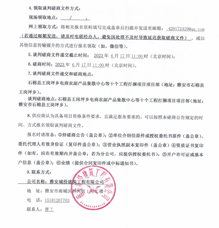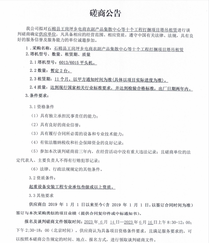 石棉縣王崗坪鄉(xiāng)電商農副產(chǎn)品集散中心等十個工程打捆項目塔吊租賃談判磋商公告
