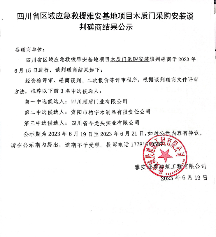 四川省區(qū)域應(yīng)急救援雅安基地項目木質(zhì)門采購安裝談判磋商結(jié)果公示
