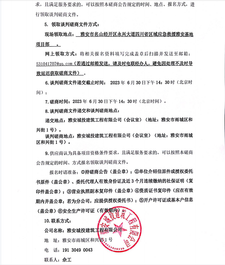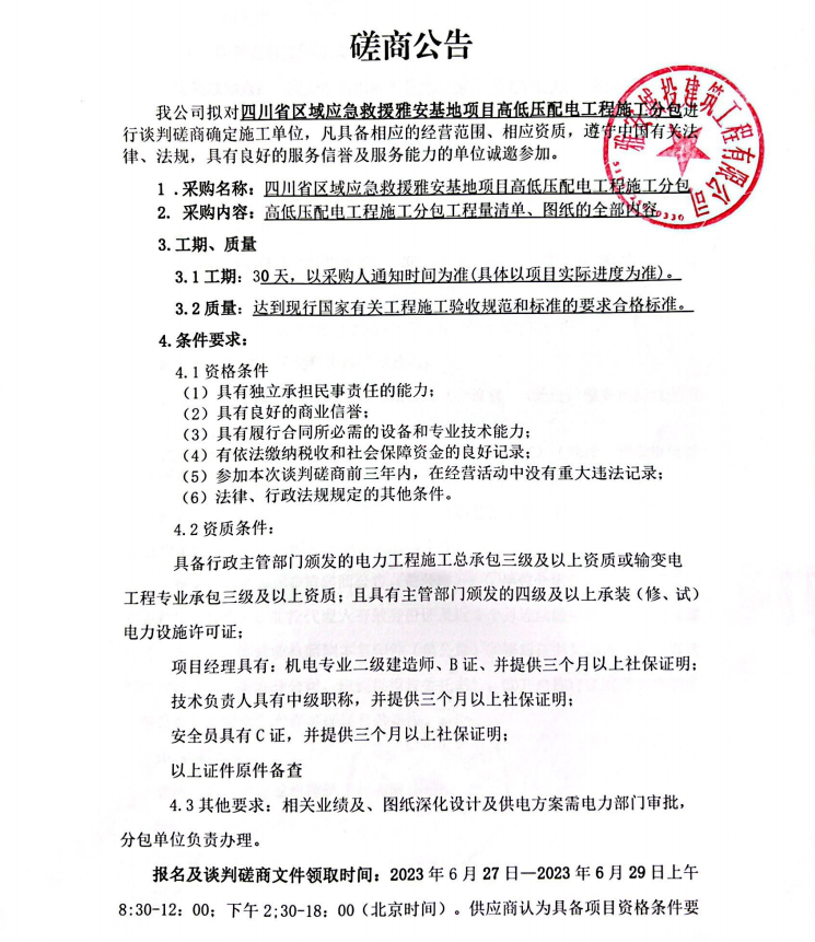 四川省區(qū)域應(yīng)急救援雅安基地項目高低壓配電工程施工分包談判磋商公告