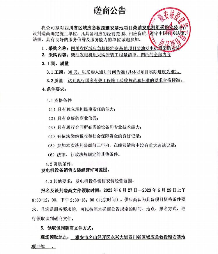 四川省區(qū)域應(yīng)急救援雅安基地項(xiàng)目柴油發(fā)電機(jī)組采購(gòu)安裝談判磋商公告