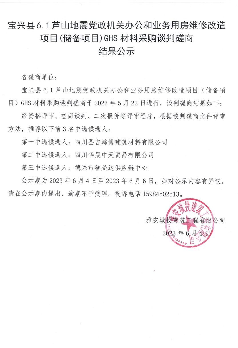 寶興縣6.1蘆山地震黨政機(jī)關(guān)辦公和業(yè)務(wù)用房維修改造項目(儲備項目)GHS材料采購談判磋商結(jié)果公示