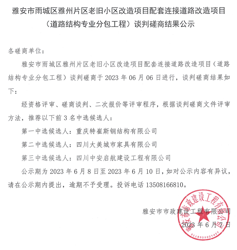 雅安市雨城區(qū)雅州片區(qū)老舊小區(qū)改造項(xiàng)目配套連接道路改造項(xiàng)目(道路結(jié)構(gòu)專(zhuān)業(yè)分包工程)談判磋商結(jié)果公示
