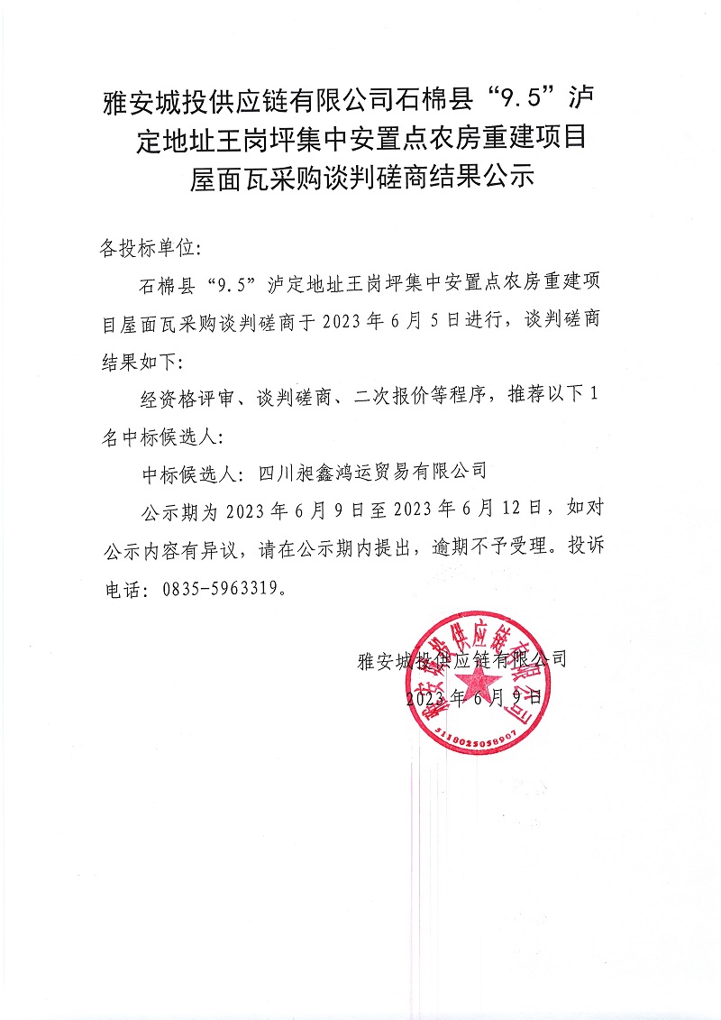 雅安城投供應(yīng)鏈有限公司石棉縣“9.5”瀘定地址王崗坪集中安置點(diǎn)農(nóng)房重建項(xiàng)目屋面瓦采購(gòu)談判磋商結(jié)果公示