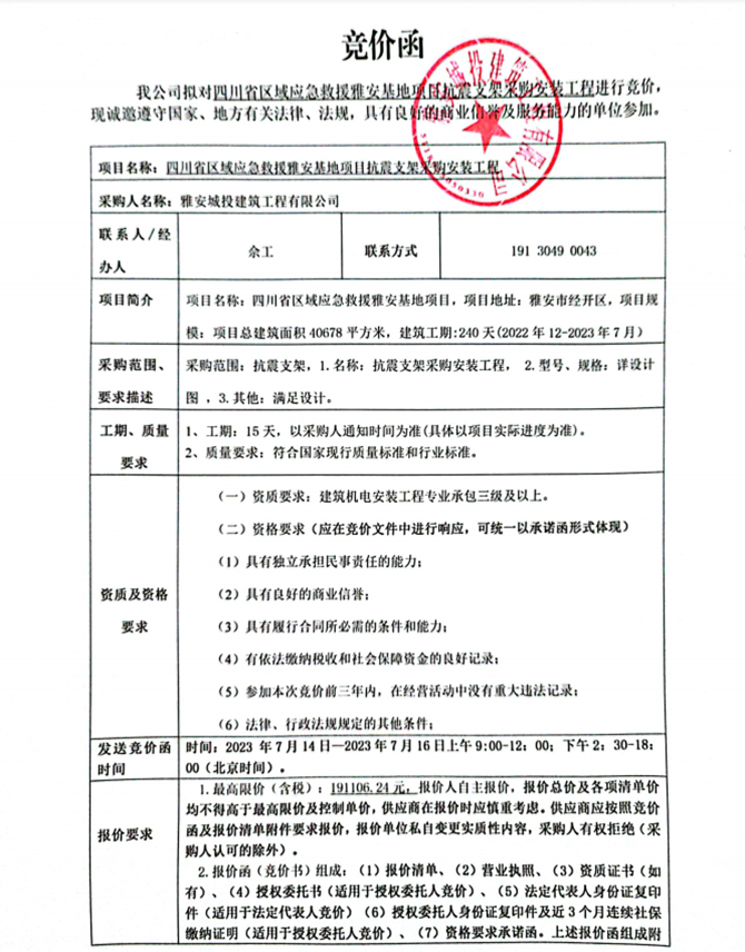 四川省區(qū)域應急救援雅安基地項目抗震支架采購安裝工程競價公告