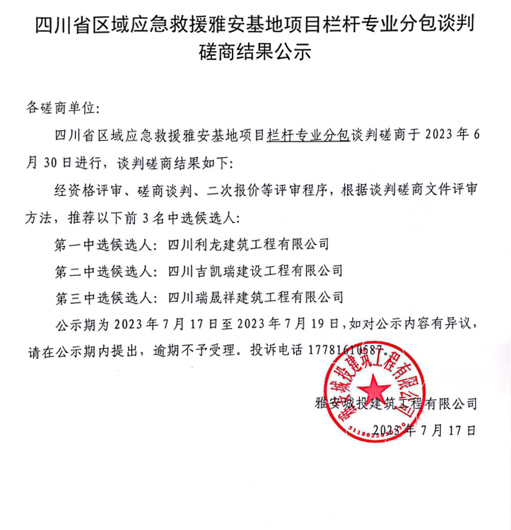 四川省區(qū)域應急救援雅安基地項目欄桿專業(yè)分包談判磋商結果公示