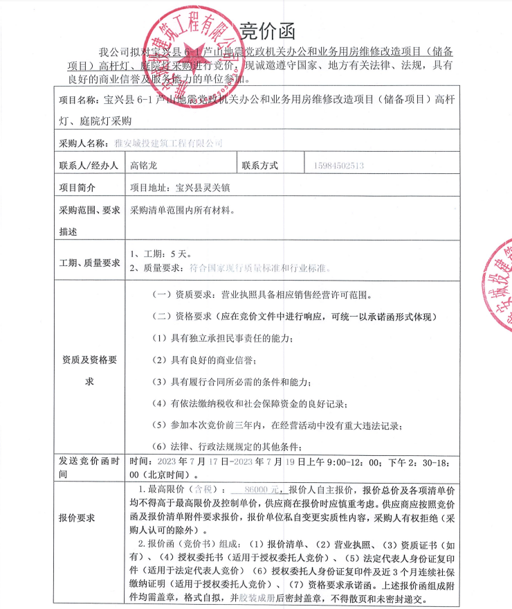 寶興縣6-1蘆山地震黨政機(jī)關(guān)辦公和業(yè)務(wù)用房維修改造項(xiàng)目(儲(chǔ)備項(xiàng)目)高桿燈、庭院燈采購競價(jià)公告