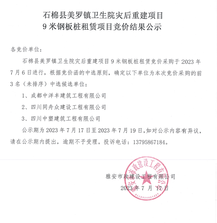 石棉縣美羅鎮(zhèn)衛(wèi)生院災(zāi)后重建項(xiàng)目9米鋼板樁租賃項(xiàng)目競價(jià)結(jié)果公示