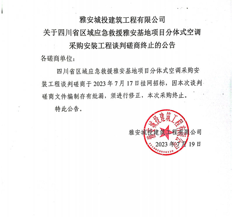 雅安城投建筑工程有限公司關(guān)于四川省區(qū)域應(yīng)急救援雅安基地項(xiàng)目分體式空調(diào)采購(gòu)安裝工程談判磋商終止的公告