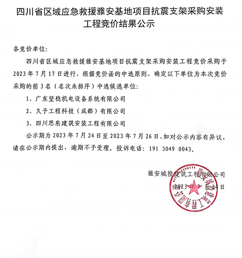 四川省區(qū)域應急救援雅安基地項目抗震支架采購安裝工程競價結(jié)果公示