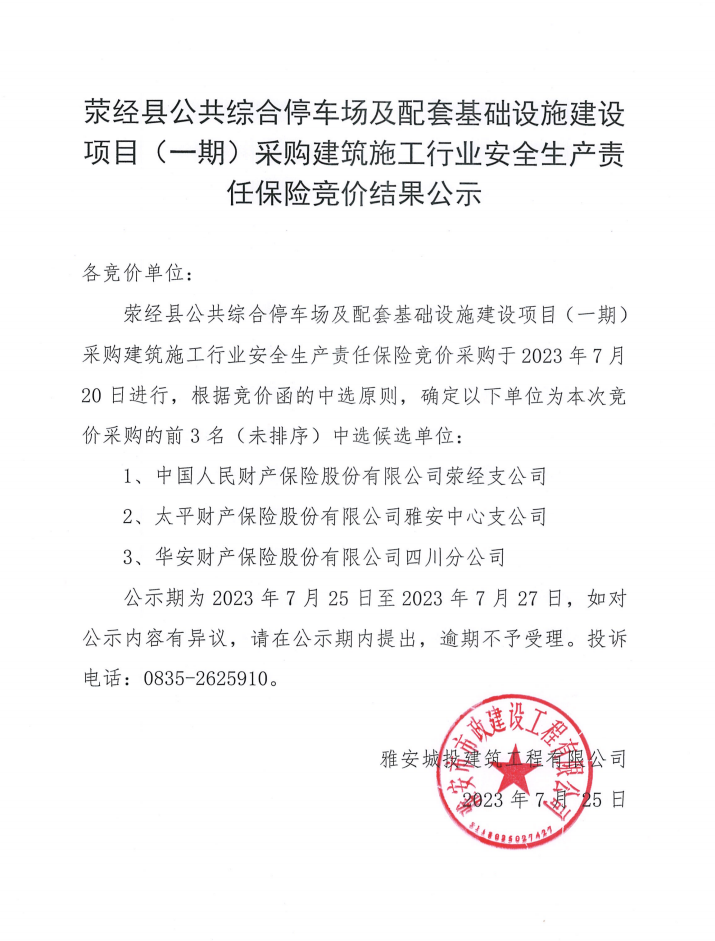 滎經(jīng)縣公共綜合停車場及配套基礎設施建設項目(一期)采購建筑施工行業(yè)安全生產(chǎn)責任保險競價結(jié)果公示