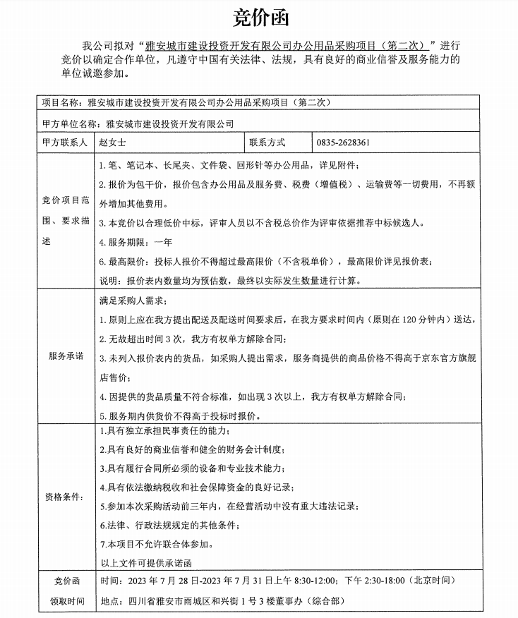 雅安城市建設投資開發(fā)有限公司辦公用品采購項目(第二次)競價公告