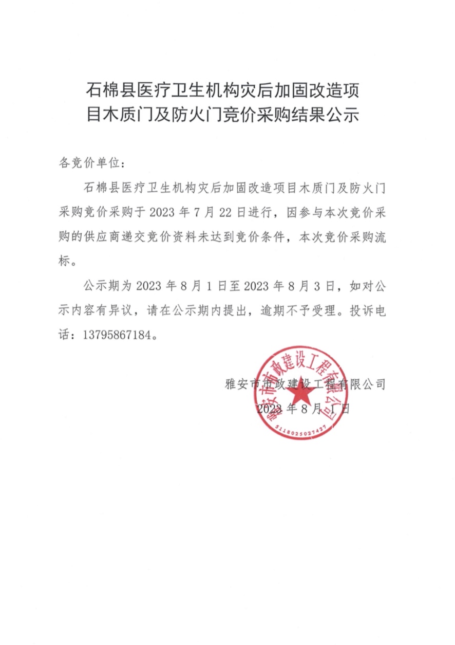 石棉縣醫(yī)療衛(wèi)生機(jī)構(gòu)災(zāi)后加固改造項(xiàng)目木質(zhì)門及防火門競(jìng)價(jià)采購(gòu)結(jié)果公示