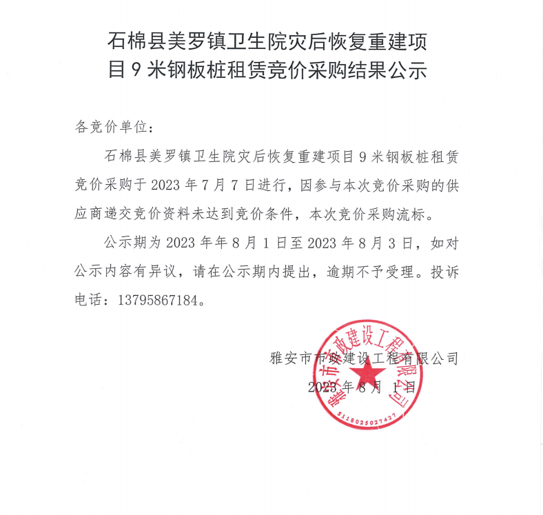 石棉縣美羅鎮(zhèn)衛(wèi)生院災后恢復重建項目9米鋼板樁租賃競價采購結(jié)果公示