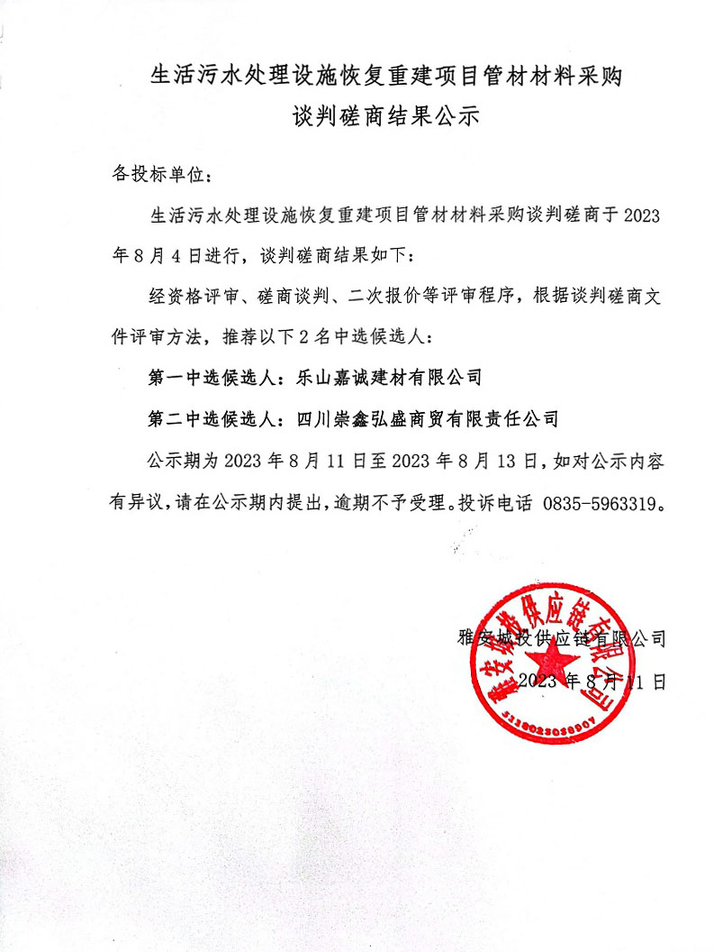 生活污水處理設(shè)施恢復(fù)重建項目管材材料采購談判磋商結(jié)果公示