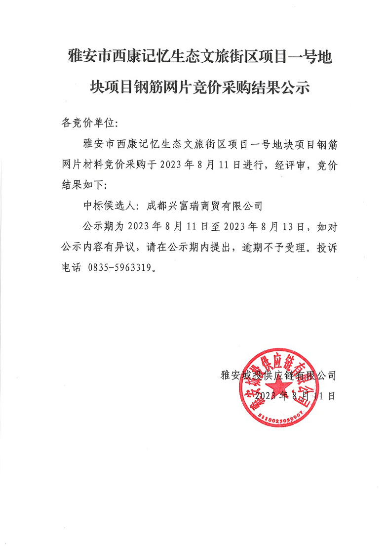 雅安市西康記憶生態(tài)文旅街區(qū)項目一號地塊項目鋼筋網片競價采購結果公示