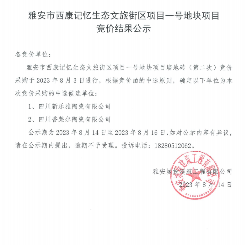 雅安市西康記憶生態(tài)文旅街區(qū)項目一號地塊項目墻地磚(第二次)競價結果公示