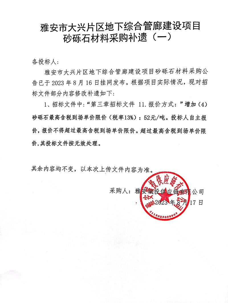雅安市大興片區(qū)地下綜合管廊建設(shè)項(xiàng)目砂礫石材料采購補(bǔ)遺(一)