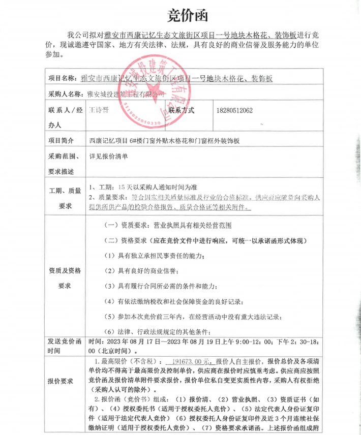 雅安市西康記憶生態(tài)文旅街區(qū)項(xiàng)目一號地塊木格花、裝飾板采購競價公告