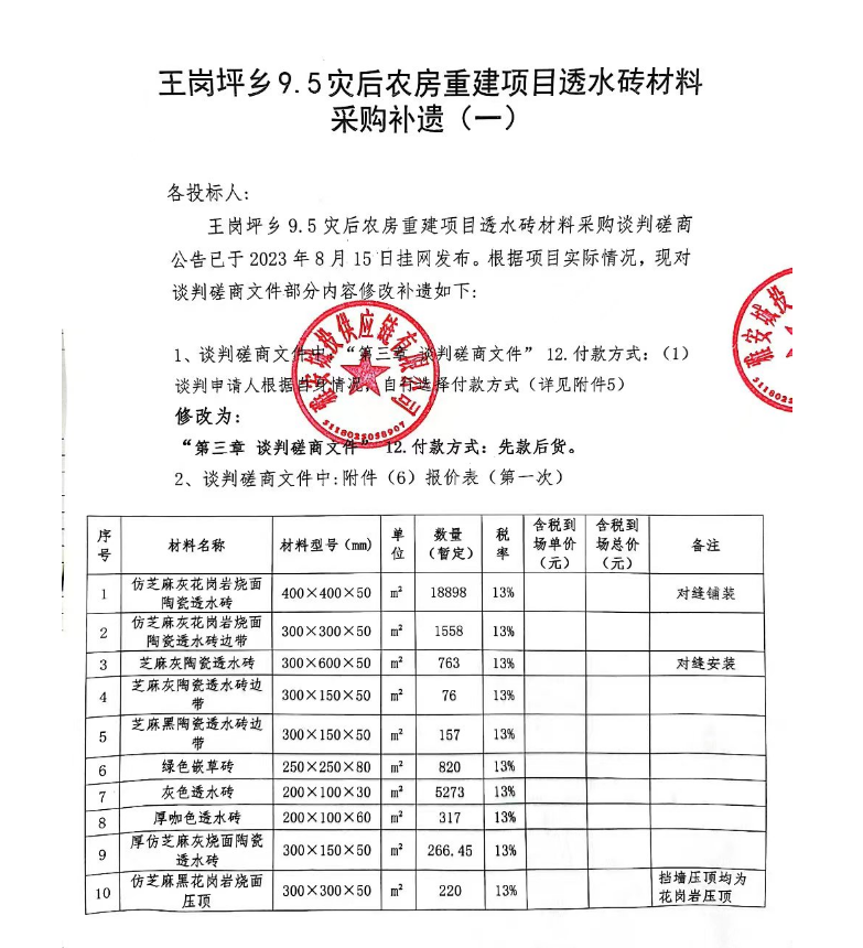王崗坪鄉(xiāng)9.5災(zāi)后農(nóng)房重建項目透水磚材料采購補(bǔ)遺(一)