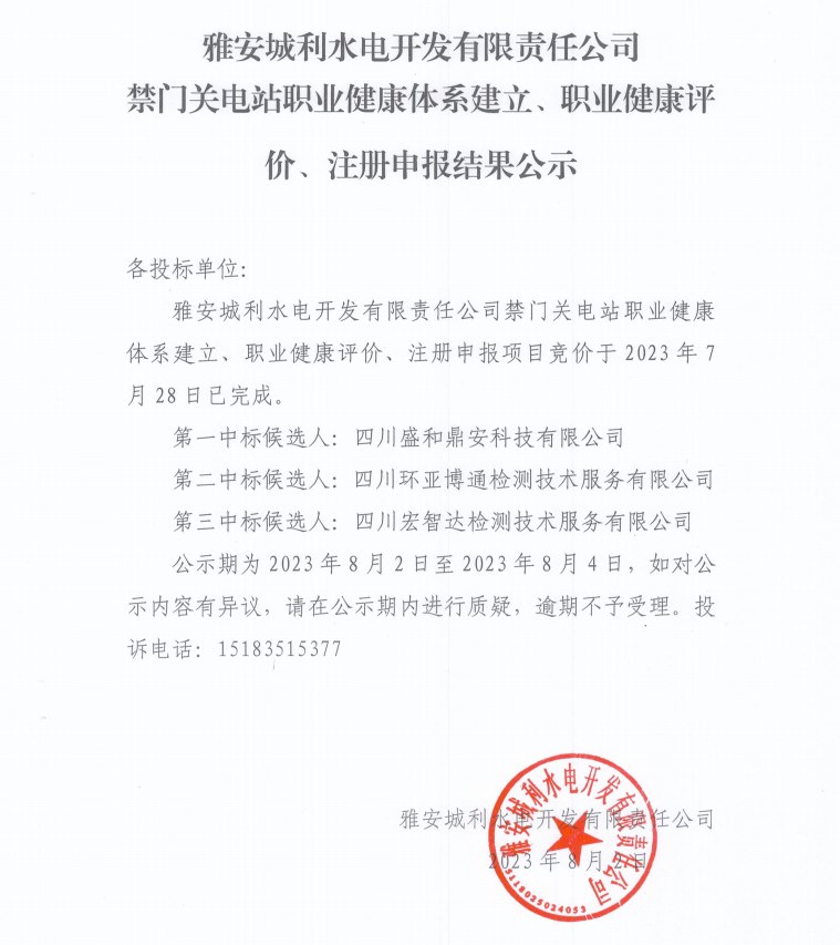雅安城利水電開發(fā)有限責(zé)任公司禁門關(guān)電站職業(yè)健康體系建立、職業(yè)健康評價(jià)、注冊申報(bào)結(jié)果公示
