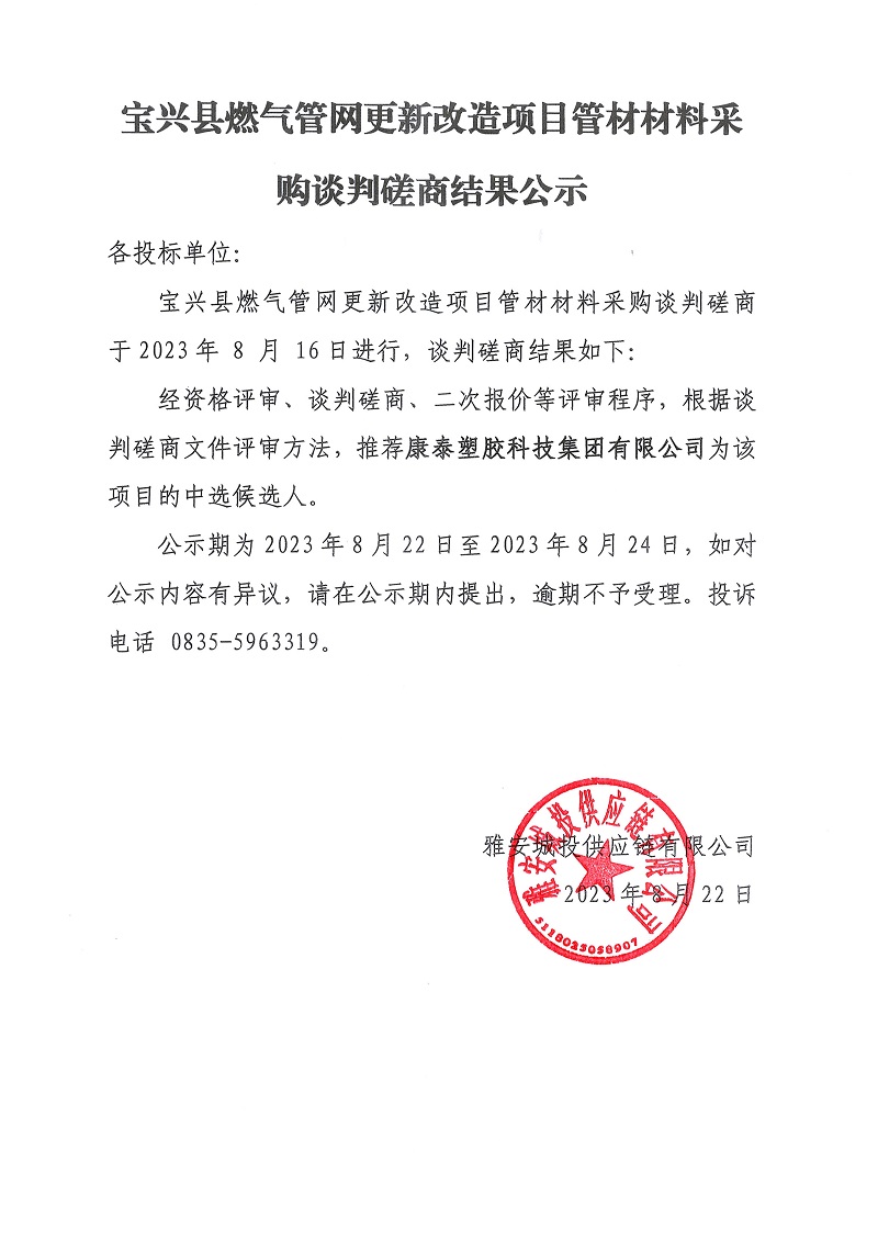 寶興縣燃氣管網更新改造項目管材材料采購談判磋商結果公示