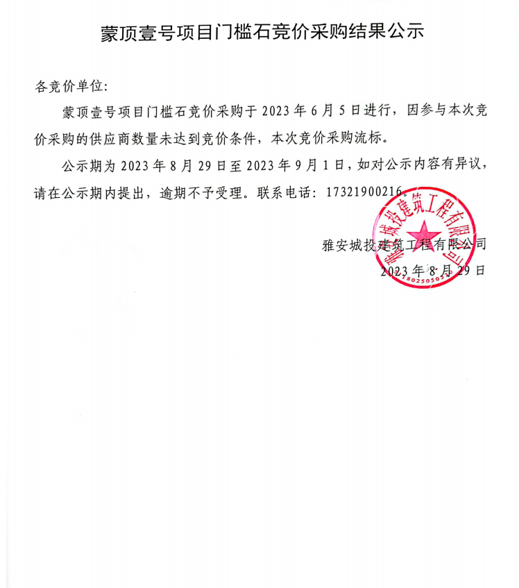 蒙頂壹號項目門檻石競價采購結(jié)果公示
