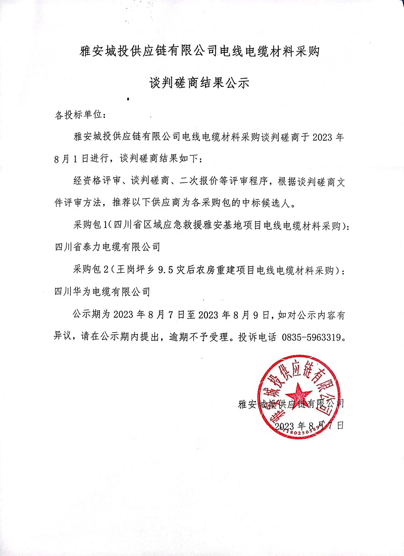 雅安城投供應鏈有限公司電線電纜材料采購談判磋商結(jié)果公示