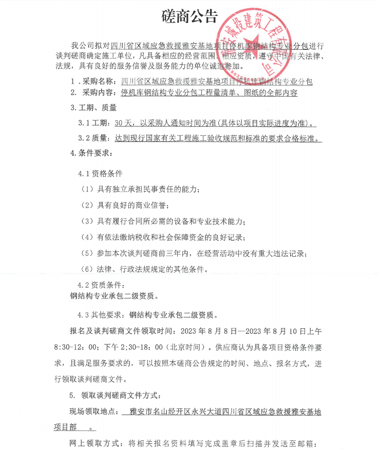 四川省區(qū)域應(yīng)急救援雅安基地項(xiàng)目停機(jī)庫鋼結(jié)構(gòu)專業(yè)分包談判磋商公告