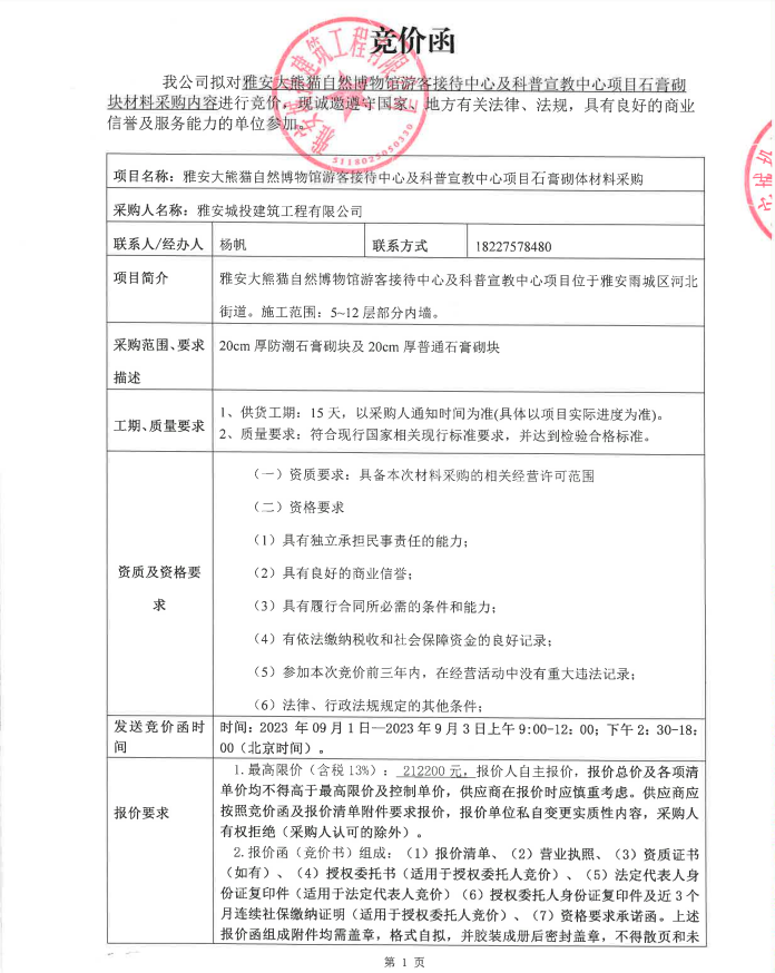 雅安大熊貓自然博物館游客接待中心及科普宣教中心項(xiàng)目石膏砌塊材料采購內(nèi)容競(jìng)價(jià)公告