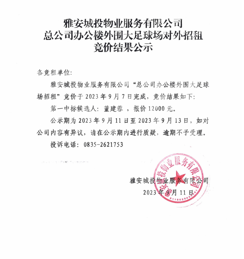 雅安城投物業(yè)服務(wù)有限公司總公司辦公樓外圍大足球場對外招租競價(jià)結(jié)果公示