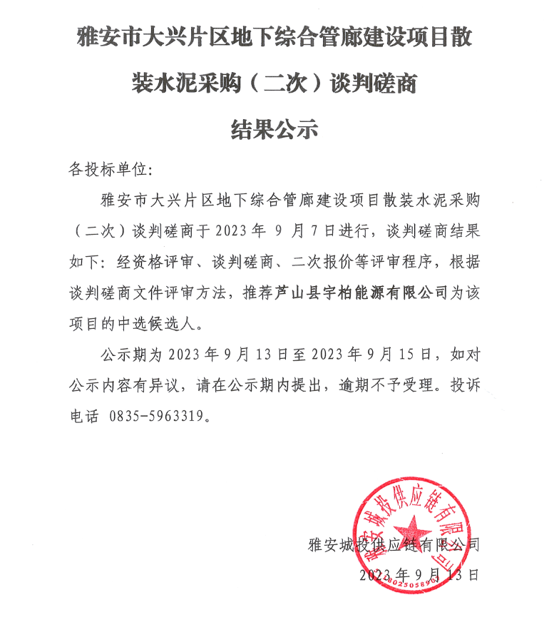 雅安市大興片區(qū)地下綜合管廊建設項目散裝水泥采購(二次)談判磋商結果公示