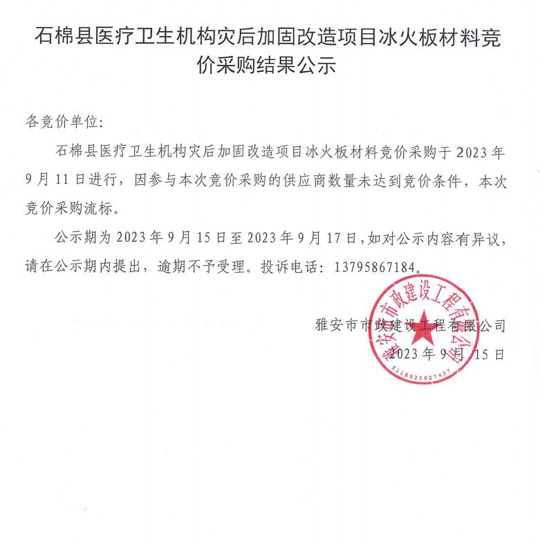 石棉縣醫(yī)療衛(wèi)生機(jī)構(gòu)災(zāi)后加固改造項(xiàng)目冰火板材料競價(jià)采購結(jié)果公示