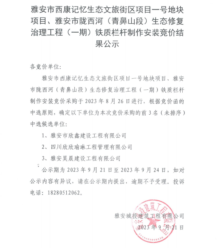 雅安市西康記憶生態(tài)文旅街區(qū)項目一號地塊項目、雅安市隴西河(青鼻山段)生態(tài)修復(fù)治理工程(一期)鐵質(zhì)欄桿制作安裝競價結(jié)果公示